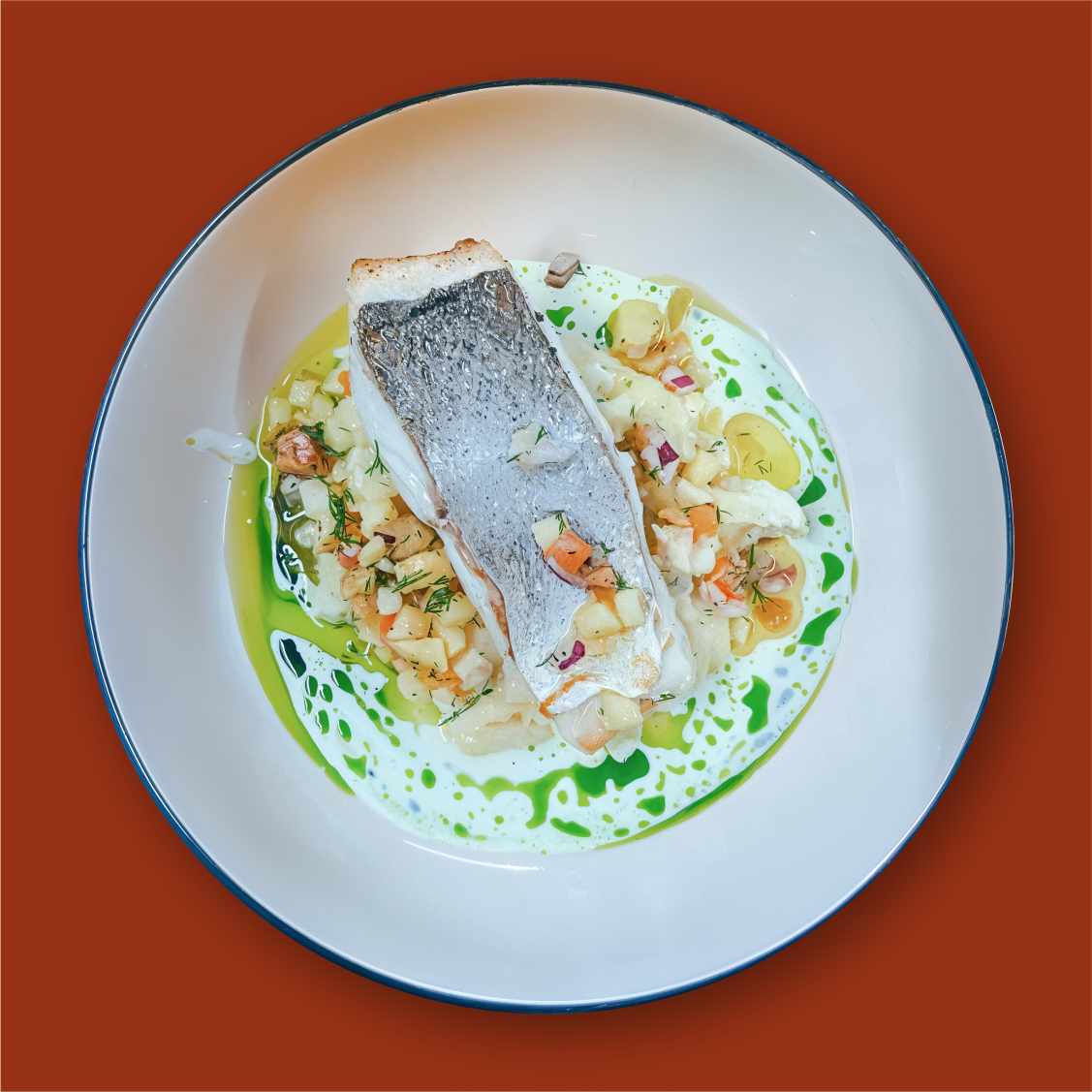 Vichyssoise, oignons frits, chips de patates, pesto de poireaux